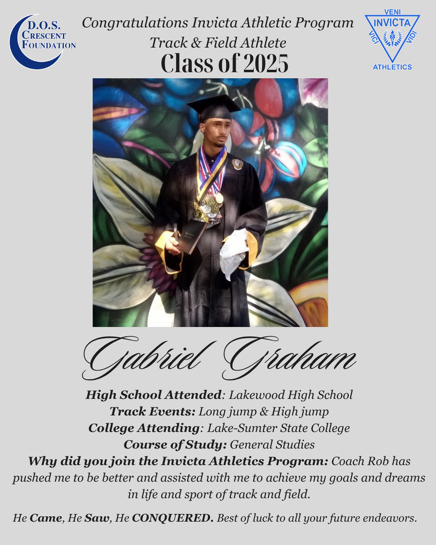 Invicta Athletics Program was founded in June 2017 under the DOS Crescent Foundation Inc. 501c3. The Invicta Athletic Program positively impacts youth in Pinellas County through the following sports: Cross Country, Track & Field, Basketball Ball and Flag Football. The objective of the program is to teach the value of teamwork through achievements of higher fitness levels and improved health. Demonstrable results through the redirection of child obesity, delinquent behavior and crime among youth in our community